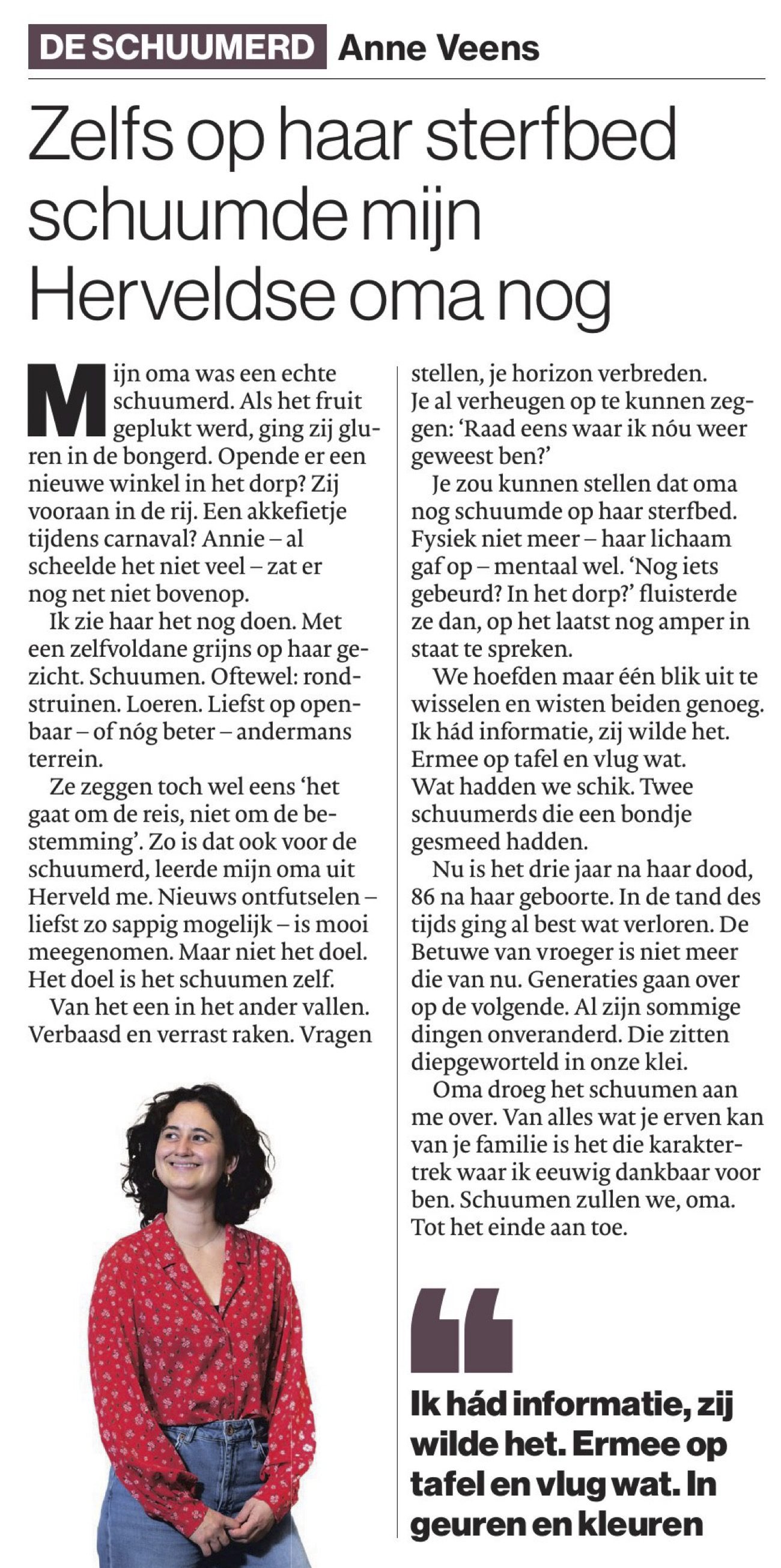 Lees hieronder mijn eerste column, waarin ik vertel hoe mijn oma Annie uit Herveld haar leven lang een echte ‘schuumerd’ was. Of bekijk het online dossier op voor een compleet overzicht.