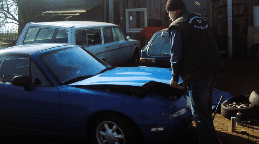 Frank sleutelt aan een auto op zijn erf. © Anne Veens