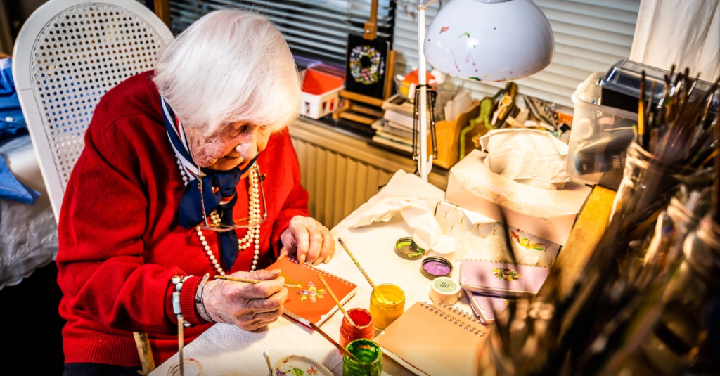Wivien van Berkel uit Rheden (98) beschildert notitieboekjes. Bijzondere geschenkjes voor het zorgpersoneel in de ziekenhuizen. © Rolf Hensel