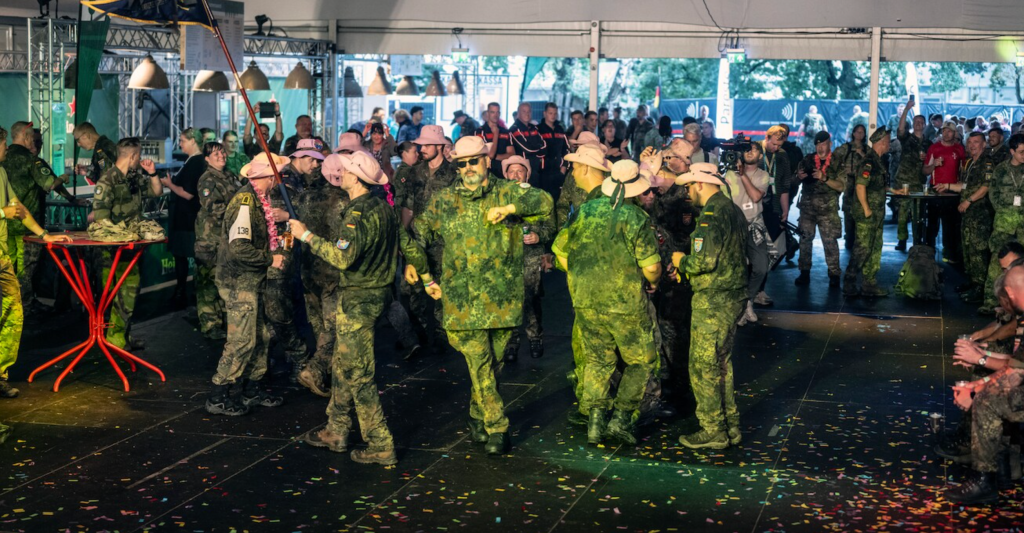 De ene groep pakt nog grootser uit dan de andere. Zo rijdt een Duitse eenheid een van hun militairen naar binnen in een bolderkar. Hij ligt voor pampus, kijkt volledig verslagen. Tot hij ineens opspringt: mét microfoon. Anderen komen met gasmaskers of vikinghelmen op – of studeren een volwaardige dansact in. Als In the Navy van de Village People klinkt, zingt de hele tent mee.