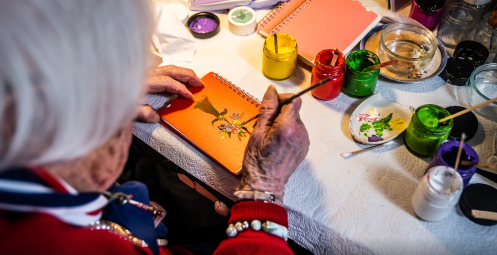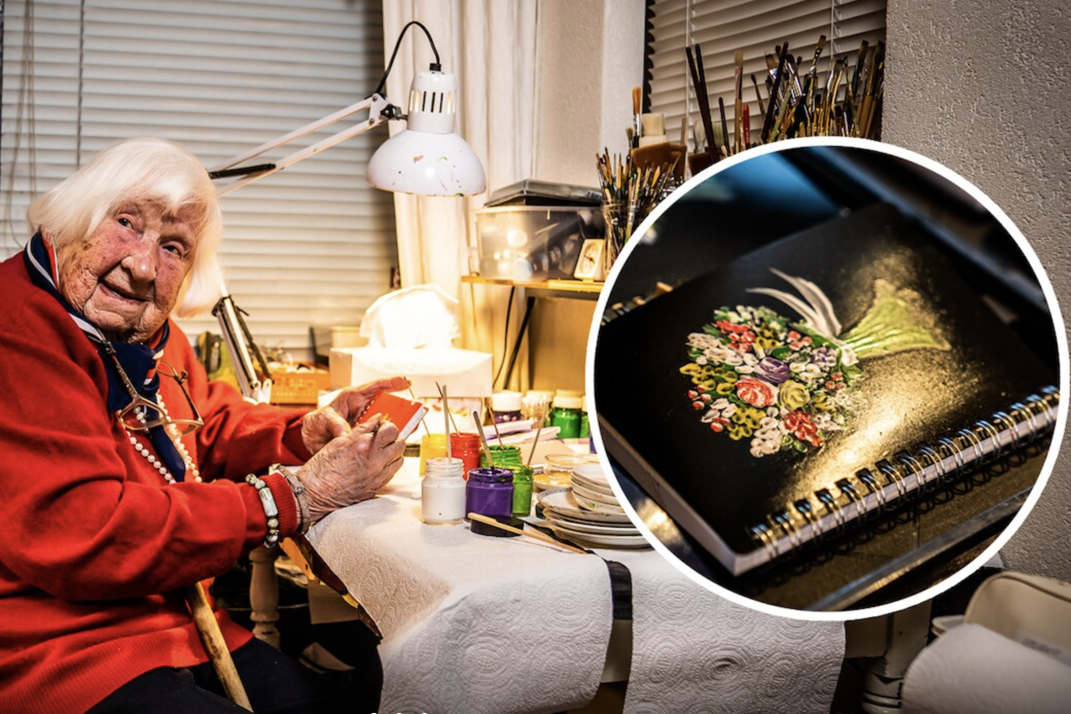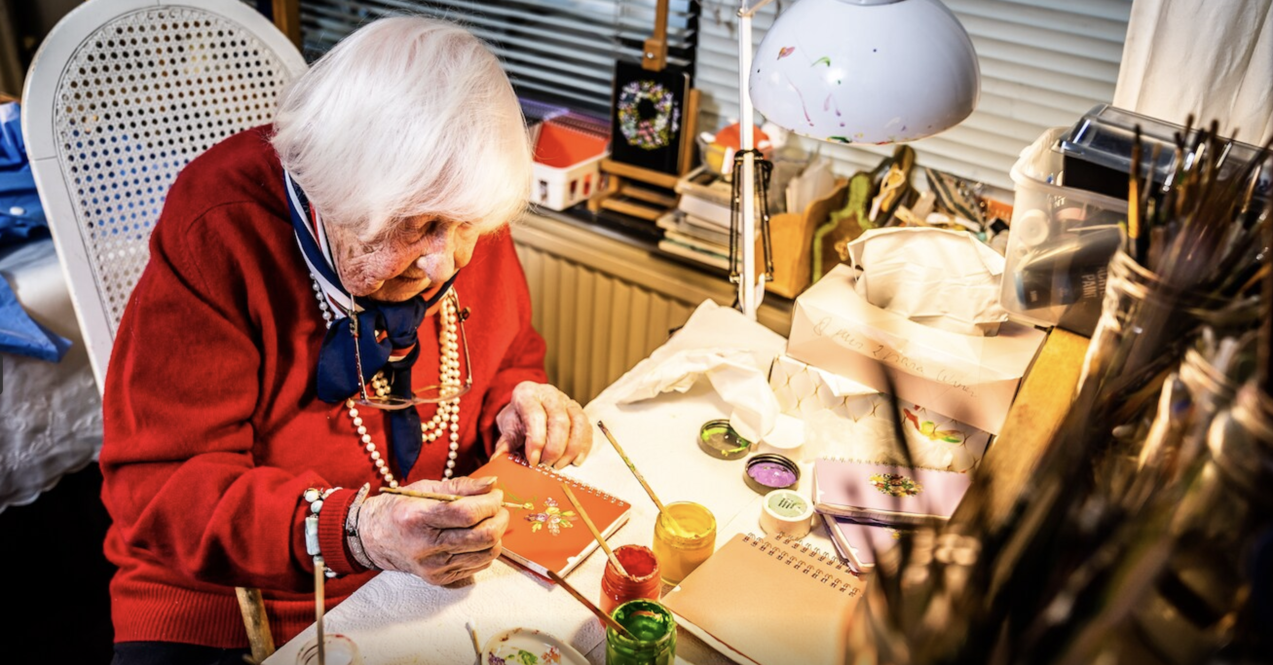 Wivien van Berkel uit Rheden (98) beschildert notitieboekjes. Bijzondere geschenkjes voor het zorgpersoneel in de ziekenhuizen. inzet : zorgboekje © Rolf Hensel